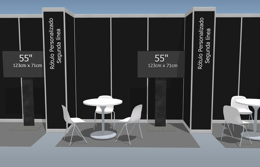 * El stand no incluye gráficas. Queda prohibido taladrar, pegar o colgar ningún elemento en las paredes de este. El cliente puede aportar elementos gráficos autoportantes tipo display o roll up.